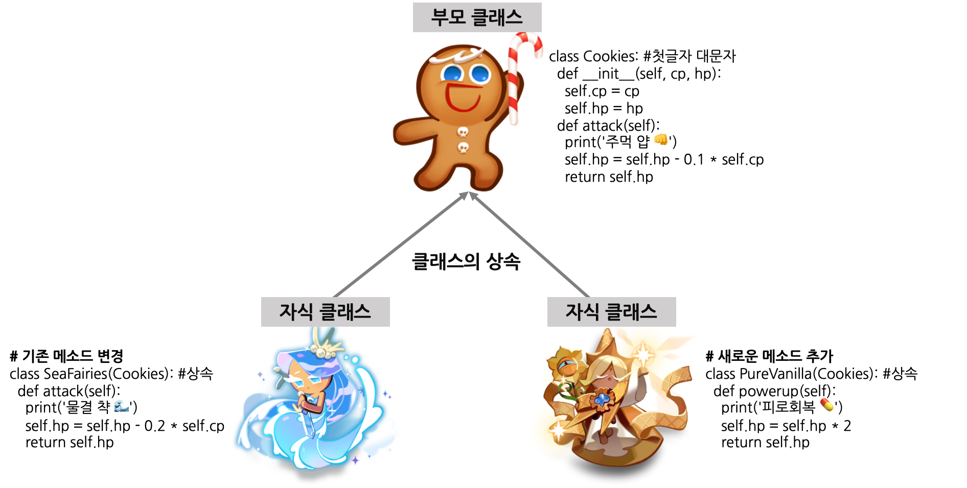 - 좌측 바다요정 쿠키 클래스는 용감한 쿠키 클래스를 상속받고 있고, attack 메소드를 물결 공격으로 덮어쓰고, hp 변화량 또한 바꿈으로써 atttack 메소드를 오버라이딩 하였습니다.